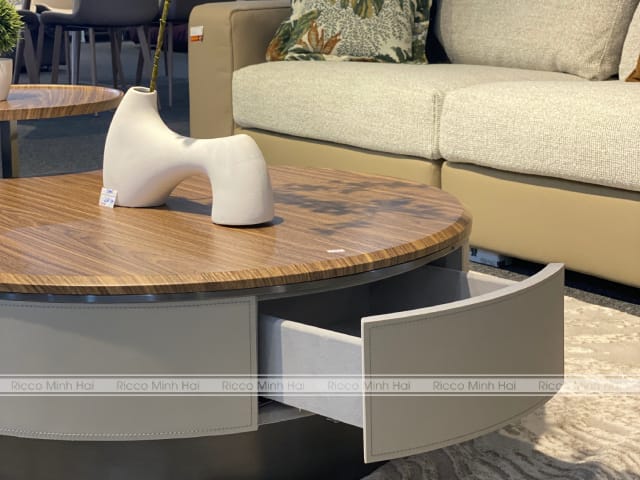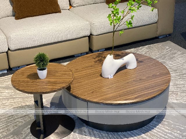 Bộ bàn trà đôi gồm hai bàn tròn thiết kế hài hòa và tiện dụng. Bàn lớn nổi bật với ngăn chứa đồ thông minh, giúp không gian luôn gọn gàng. Bàn nhỏ dáng cao thanh thoát, dễ dàng di chuyển và phối hợp linh hoạt. Mặt bàn gỗ màu nâu ấm áp, kết hợp cùng khung bàn bọc da và kim loại tạo nên tổng thể vừa sang trọng vừa ấm cúng.