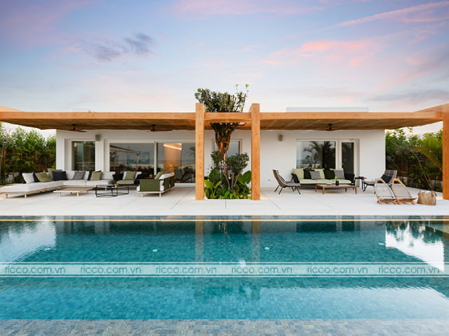 Mẫu gạch lát bể bơi tone kem nhạt đơn giản mà đẹp
