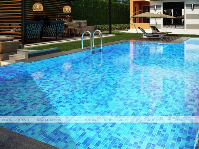 Gạch ốp bể bơi mosaic màu xanh góp phần tăng tính thẩm mỹ cho không gian