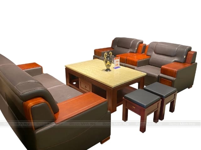 Bộ sofa văn phòng cao cấp nổi bật với thiết kế mạnh mẽ, sang trọng và đầy uy quyền. Sự kết hợp hài hòa giữa da cao cấp màu nâu trầm và gỗ tự nhiên tông đỏ đậm tạo nên vẻ đẹp bề thế, chuẩn mực cho không gian tiếp khách lãnh đạo.