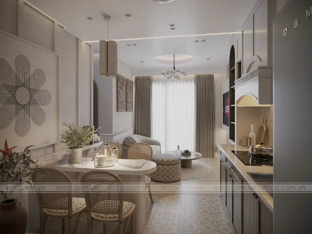 - Thiết kế phòng khách liền bếp giúp mở rộng không gian và tạo cảm giác thông thoáng.